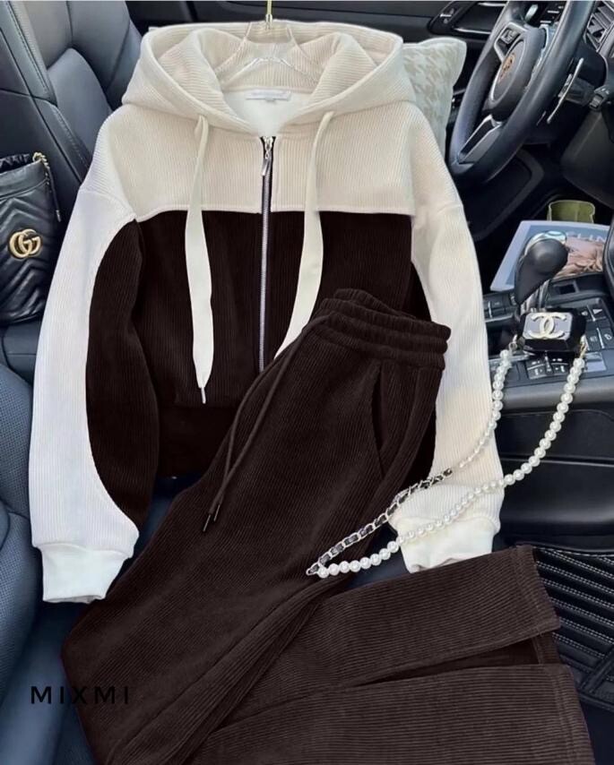 Довжина штанів : 110 см. Штани з ломпасом , з високою посадкою , пояс на гумці , бічні кишені . Кофта з ломпасом прямого покрою , низ на фіксаторі , з капюшоном , на блискавці , кишені кенгуру